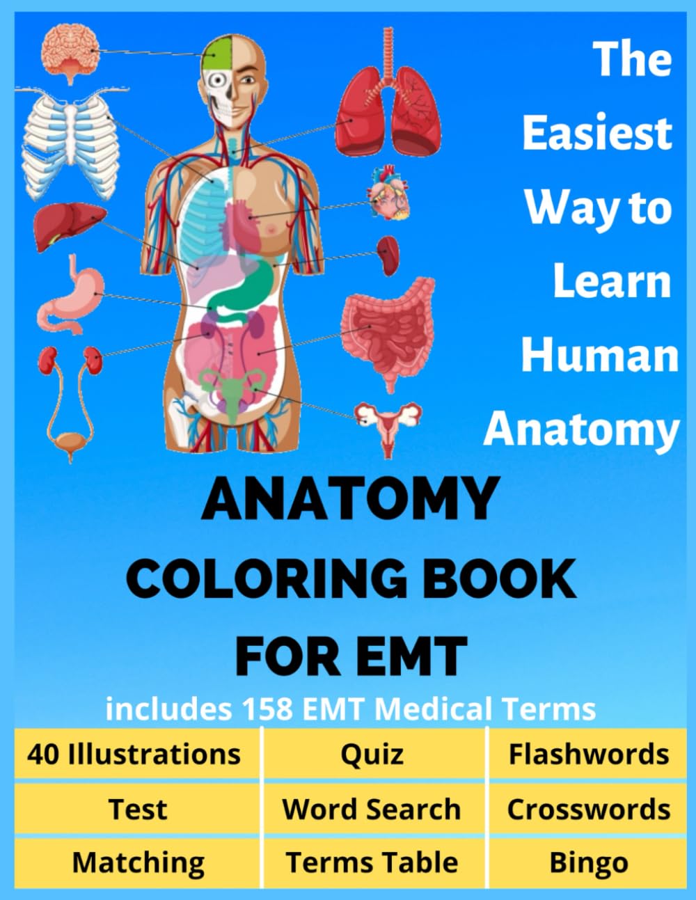 Anatomy coloring book for EMT includes 158 EMT Medical Terms - 40 Illustrations, Flashwords, Word Search, Crosswords, Quiz, Test, Matching