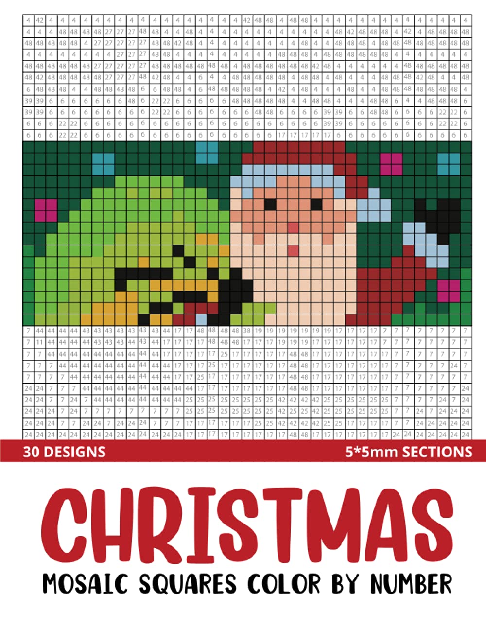 Christmas Mosaic Squares Color By Number: 30 Mystery Pixel Art Coloring Book for Adults 5*5 mm sections.
