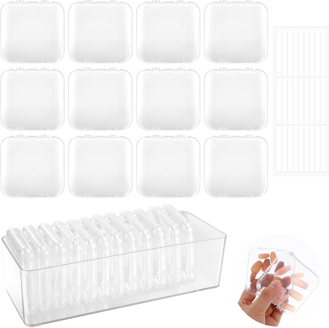 36Pcs Box Organizer Case, Press on Nails Clear Display Case With 3Pcs All-In-One Storage Box and 60pcs Double Sided Adhesive Display Tape
