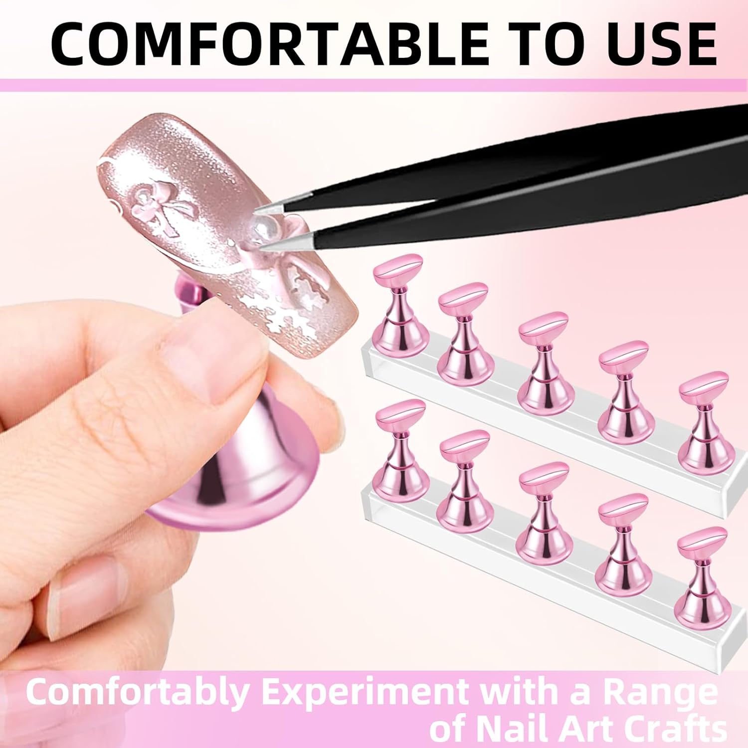 【Free Your Hands】With the nail stand for press on,you no longer need to use your non-dominant hand to hold the nails during the application process.This eliminates the risk of shaky hands causing mistakes,making it incredibly easy for beginners to get started.Whether you are a nail art beginner,an enthusiast or a professional nail technician,this magnetic nail tips practice holder set is perfect for you.Acrylic nail art practice stands also makes a wonderful gift for nail lovers or professional nail artists