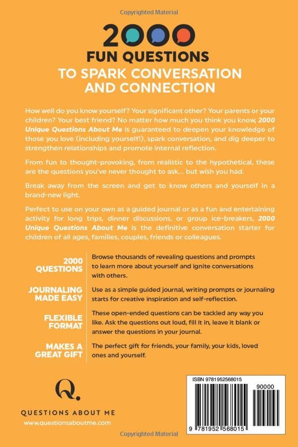 2000 Unique Questions About Me is filled with thought-provoking questions designed for deeper understanding and serves as a powerful conversation starter.