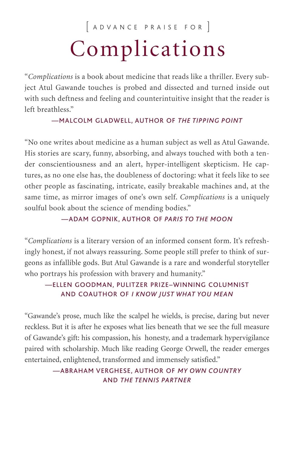 At once tough-minded and humane, Complications is a new kind of medical writing, nuanced and lucid, unafraid to confront the conflicts and uncertainties that lie at the heart of modern medicine, yet always alive to the possibilities of wisdom in this extraordinary endeavor.