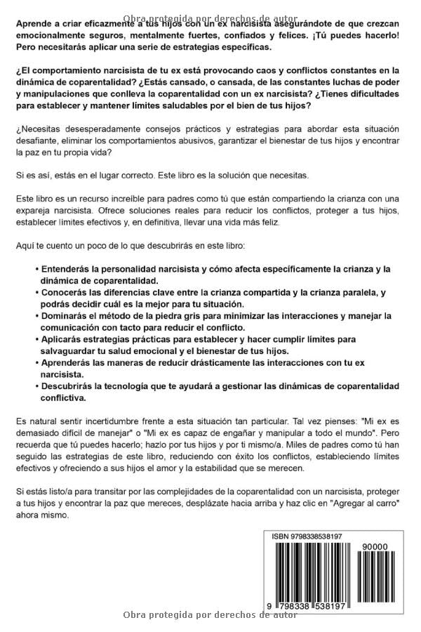 Este libro es un recurso increíble para padres como tú que están compartiendo la crianza con una expareja narcisista. Ofrece soluciones reales para reducir los conflictos, proteger a tus hijos, establecer límites efectivos y, en definitiva, llevar una vida más feliz.