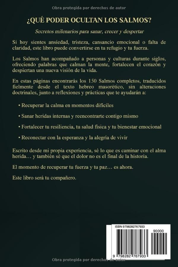 Descubre el poder milenario de los Salmos, oraciones que han sido refugio del alma humana a lo largo de los siglos. Este libro, concebido desde el corazón, busca ser un puente libre de dogmas entre la desesperanza y el milagro que esperas. Su propósito es que cada lector, sin importar su tradición, halle en ellos una fuente viva de consuelo y fortaleza.