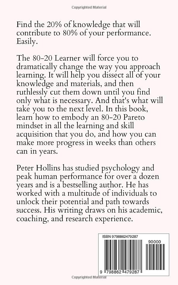 The 80-20 Learner will force you to dramatically change the way you approach learning. It will help you dissect all of your knowledge and materials, and then ruthlessly cut them down until you find only what is necessary. And that's what will take you to the next level. In this book, learn how to embody an 80-20 Pareto mindset in all the learning and skill acquisition that you do, and how you can make more progress in weeks than others can in years.