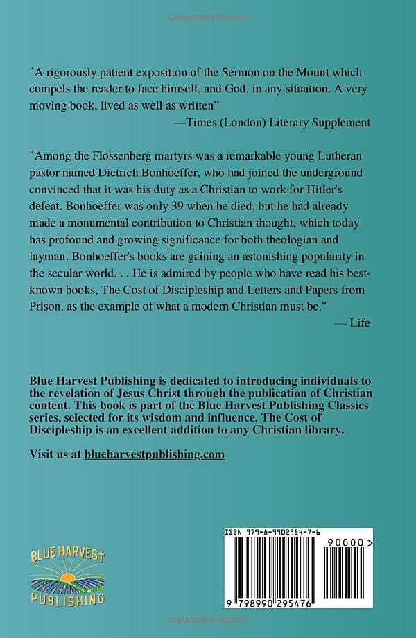 The Cost of Discipleship was first published in 1936. Blue Harvest Publishing is dedicated to introducing individuals to the revelation of Jesus Christ through the publication of Christian content. This book is part of the Blue Harvest Publishing Classics series, selected for its wisdom and influence. The Cost of Discipleship is an excellent addition to any Christian library.