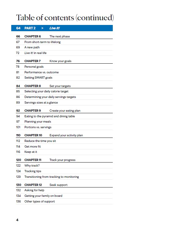 Section Two outlines Live It!, a long-term maintenance plan developed to help you stay on track and continue to lose 1 to 2 pounds a week until you reach your goal. Along the way, you’ll learn key behaviors that will help you maintain a healthy weight for life.
