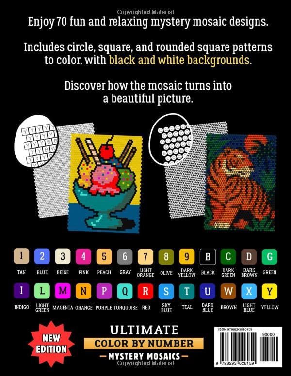 Ultimate Color by Number Mystery Mosaics: Coloring Book for Adults - Circles, Squares, Rounded Squares on Black and White Backgrounds