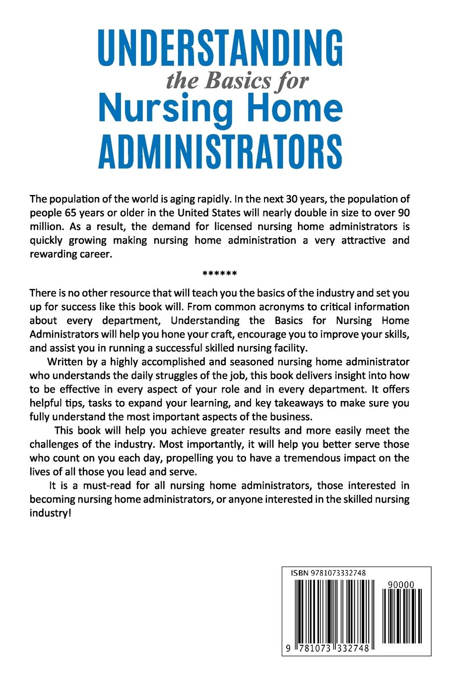 The population of the world is aging rapidly. In the next 30 years, the population of people 65 years or older in the United States will nearly double in size to over 90 million. As a result, the demand for licensed nursing home administrators is quickly growing making nursing home administration a very attractive and rewarding career.***There is no other resource that will teach you the basics of the industry and set you up for success like this book will. From common acronyms to critical information about every department, Understanding the Basics for Nursing Home Administrators will help you hone your craft, encourage you to improve your skills, and assist you in running a successful skilled nursing facility. Written by a highly accomplished and seasoned nursing home administrator who understands the daily struggles of the job, this book delivers insight into how to be effective in every aspect of your role and in every department. It offers helpful tips, tasks to expand your learning, and key takeaways to make sure you fully understand the most important aspects of the business.This book will help you achieve greater results and more easily meet the challenges of the industry. Most importantly, it will help you better serve those who count on you each day, propelling you to have a tremendous impact on the lives of all those you lead and serve. This book is a must-read for all nursing home administrators, those interested in becoming nursing home administrators, or anyone interested in the skilled nursing industry!